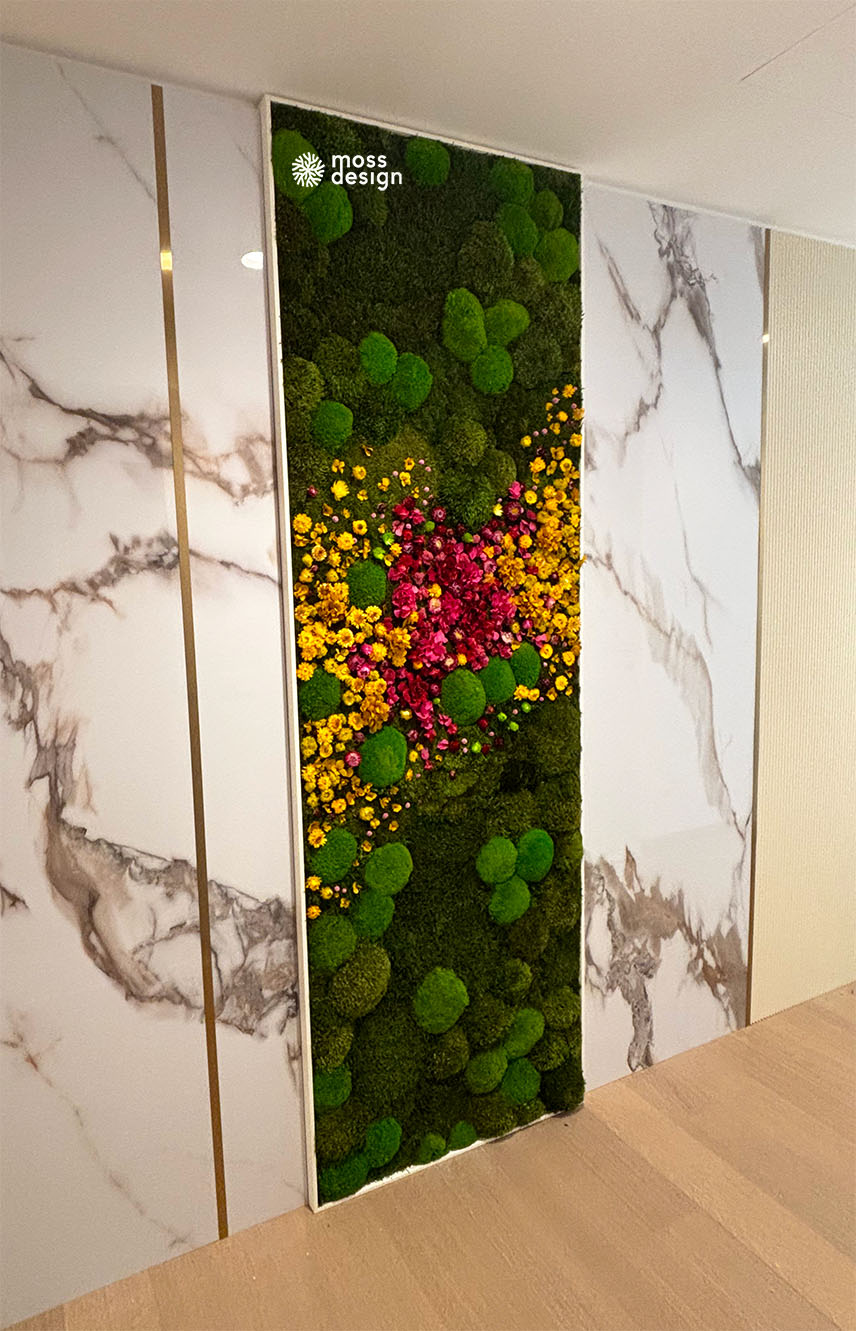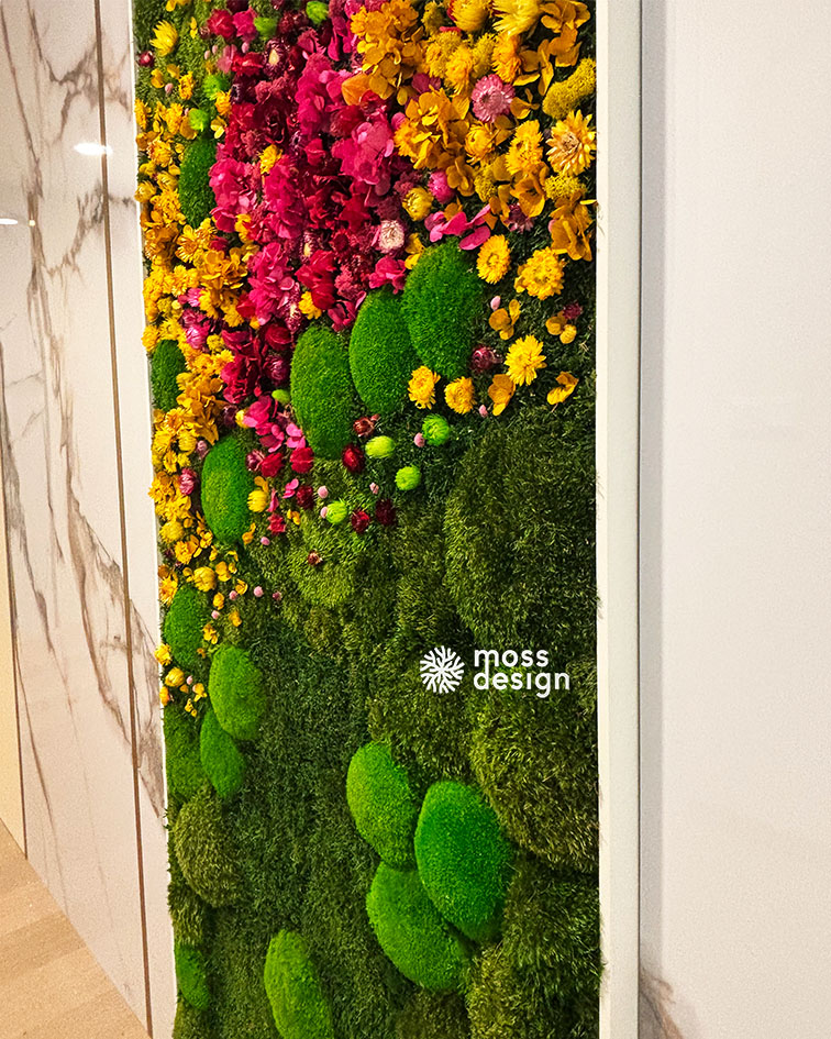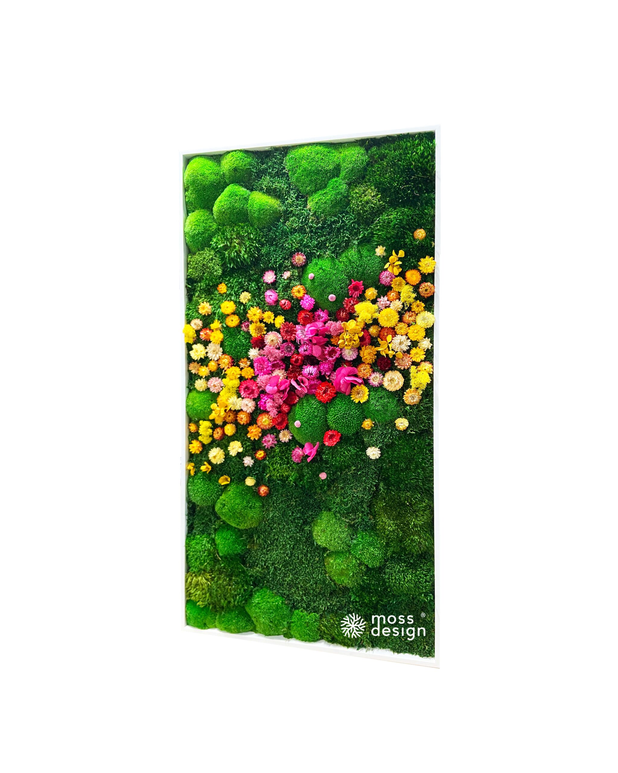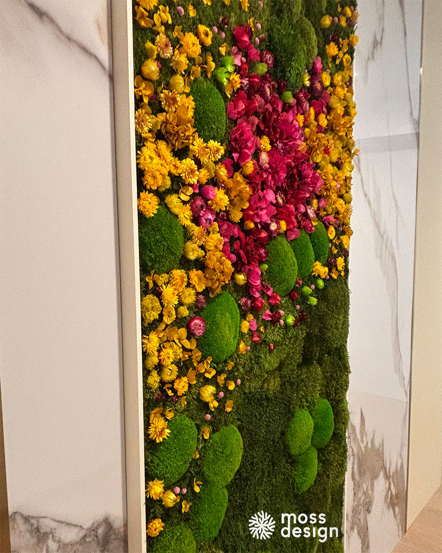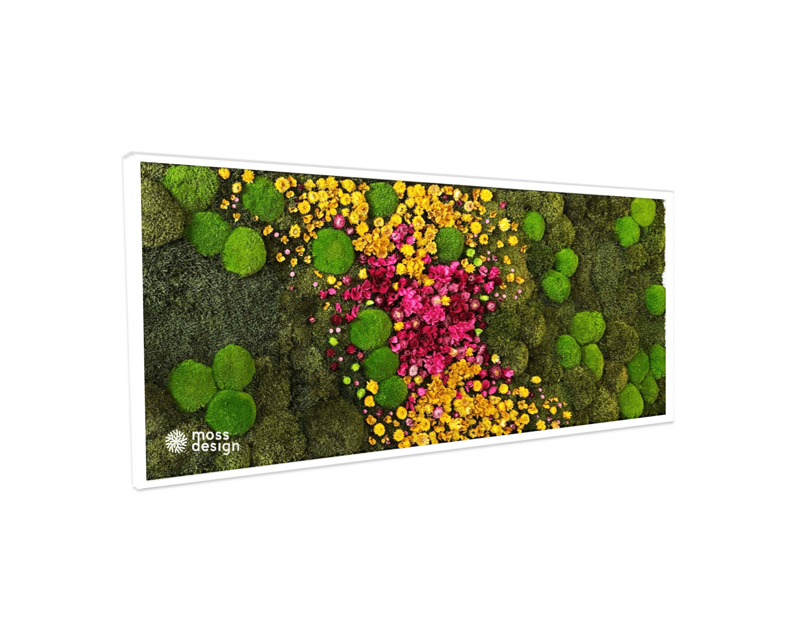Náš hranatý mechově květinový obraz FLORAL je originálním doplňkem do každého interiéru. Díky zajímavé barevné kompozici s kombinací sušených rostlin a stabilizovaných mechů je naprosto nepřehlédnutelný.