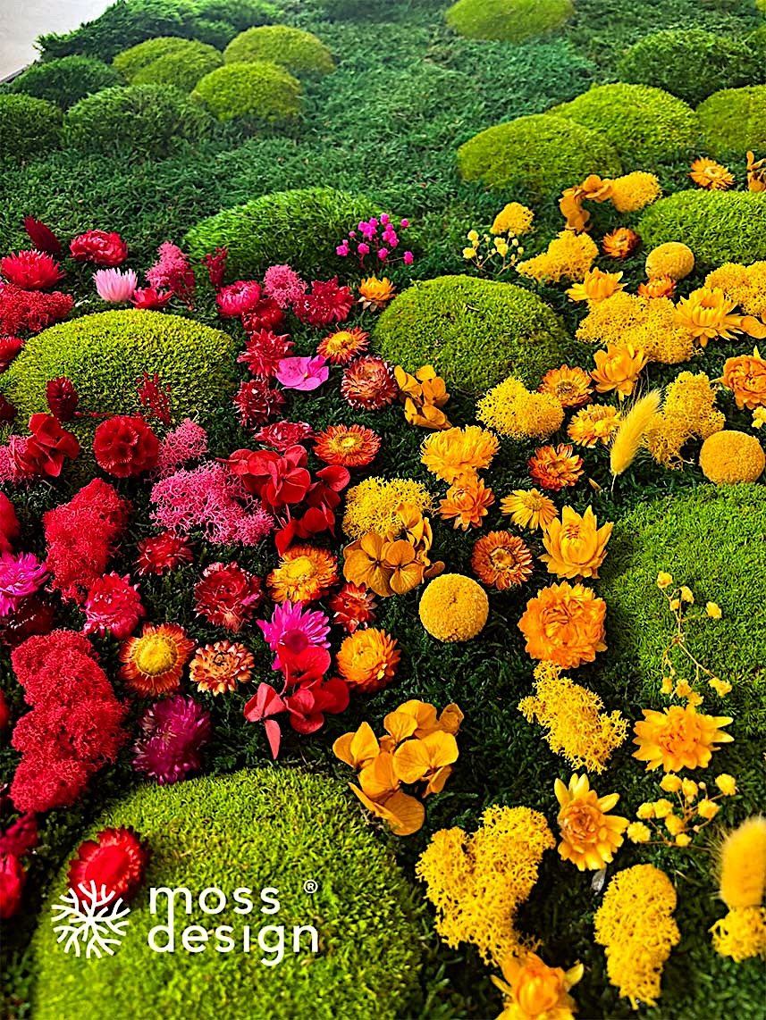 Materiál: 100% přírodní, stabilizovaný kopcovitý, lesní a sibiřský mech, stabilizovaný barevný lišejník, sušené květiny různých druhů