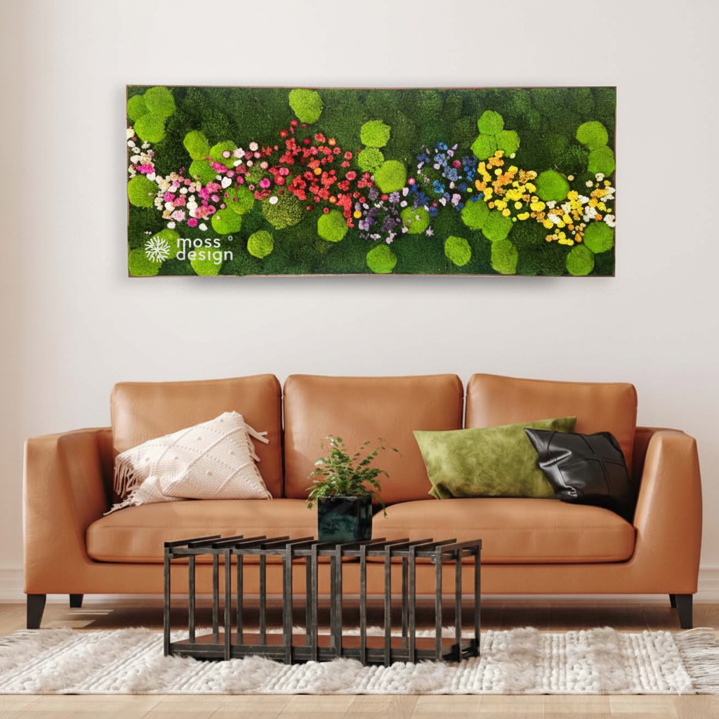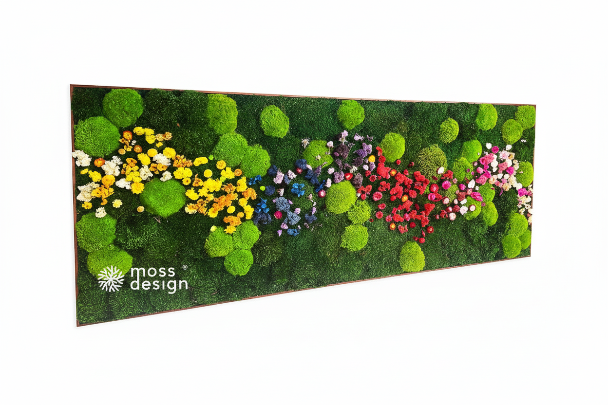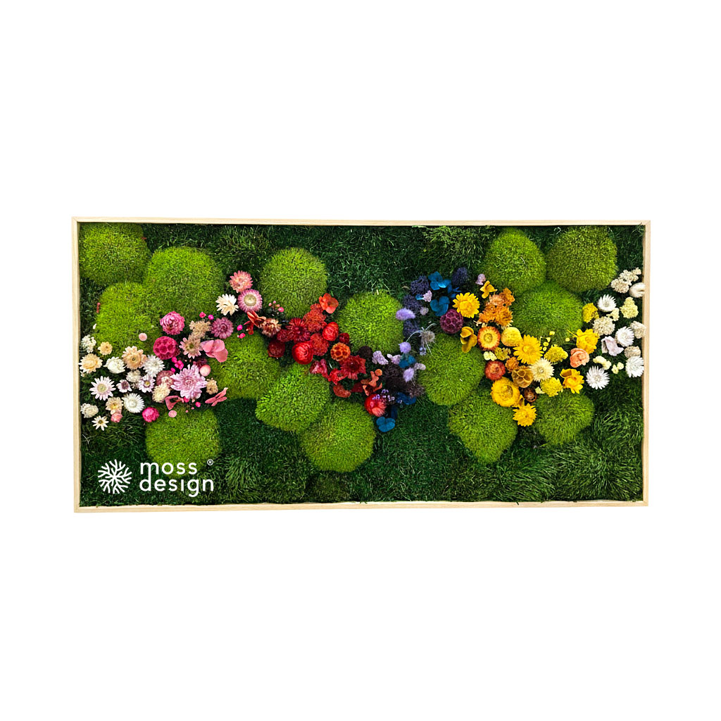 Náš hranatý mechově květinový obraz MEADOW je originálním doplňkem do každého interiéru. Díky zajímavé barevné kompozici s kombinací sušených rostlin a stabilizovaných mechů je naprosto nepřehlédnutelný.