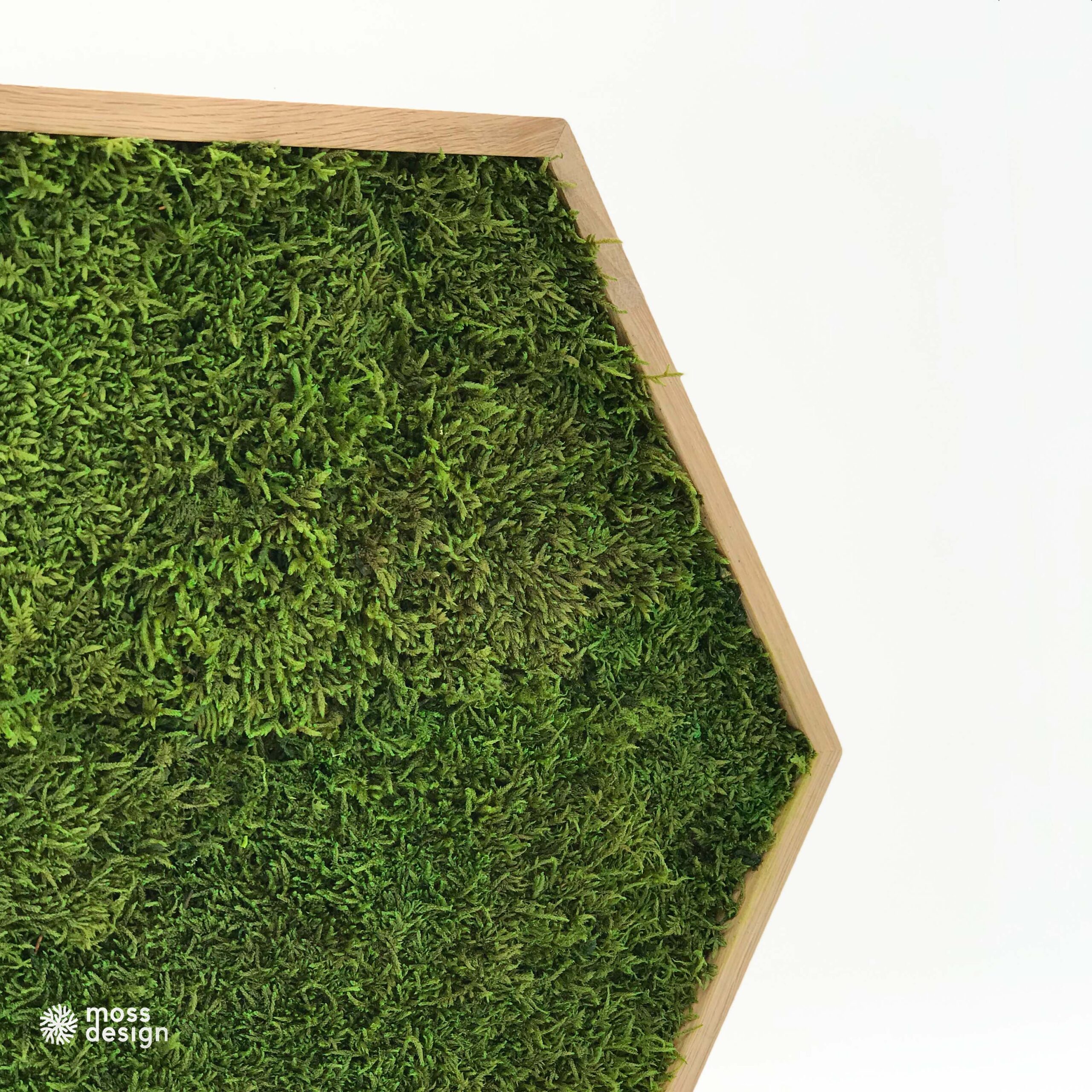 Mechový šestiúhelník je originální designový prvek, který nám umožňuje vytvářet na stěně různé zajímavé kompozice. Lesní mech si můžete objednat v černém, bílém nebo v dubovém šestiúhelníkovém rámu. Buďte tvořiví a navrhněte si jedinečnou mozaiku z vícerých rámů podle Vašich představ. Ať už samostatně, nebo v originálním uskupení několika rámů, mechový 6-úhelník může být příjemným zpestřením vašeho pokoje.